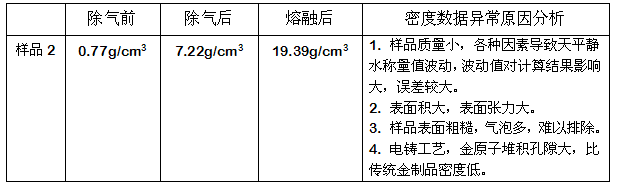 直接將樣品放入水中,由于較多的氣泡和較大的表面張力,樣品浮于水面,明顯與“金”的密度不符。經過一定的除氣操作,樣品沉入水底。由于氣泡多,數據測試不準。僅以樣品2的密度測試數據為例進行說明。